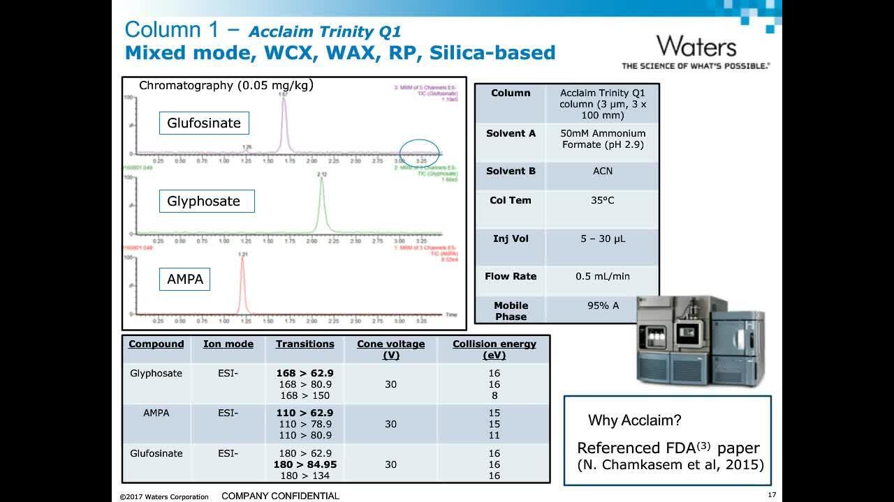 In this second webinar we present an update of our ongoing work, focusing on the analysis of anionic polar pesticides, and the use of a underivatised, LC-MS/MS approach for this analysis in various food matrices.