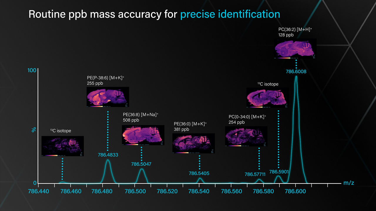 This video shows the differential spatial distributions of seven distinct, clearly resolved ions, all contained within a <150mDa window, that are easily visualized from a mouse brain tissue section.