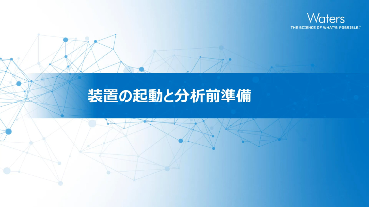 電源ONの順番、MassLynxの起動と各画面の紹介、カラム手前の配管とeCordについてご説明します。 ※音声が OFF になっています、PC の音声を ON にしてご視聴ください。