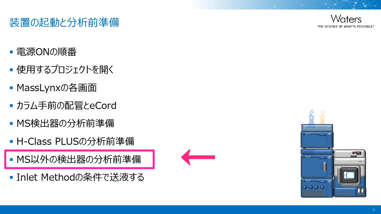 TUV、PDA、FLR、RIおよびELS検出器の分析前準備についてご説明します。 ※音声が OFF になっています、PC の音声を ON にしてご視聴ください。